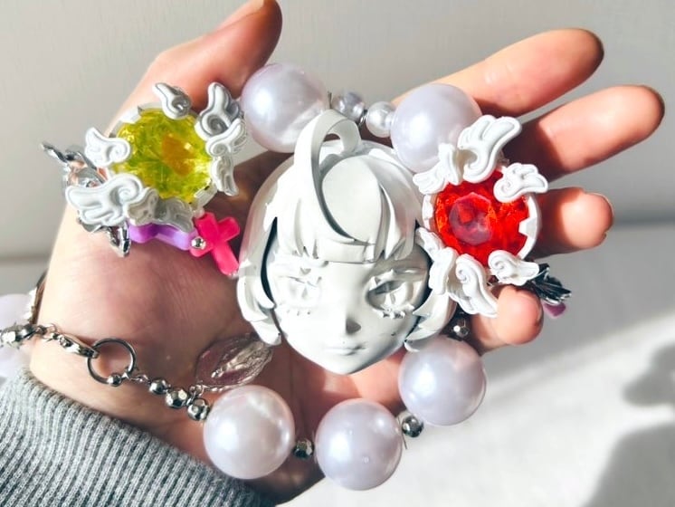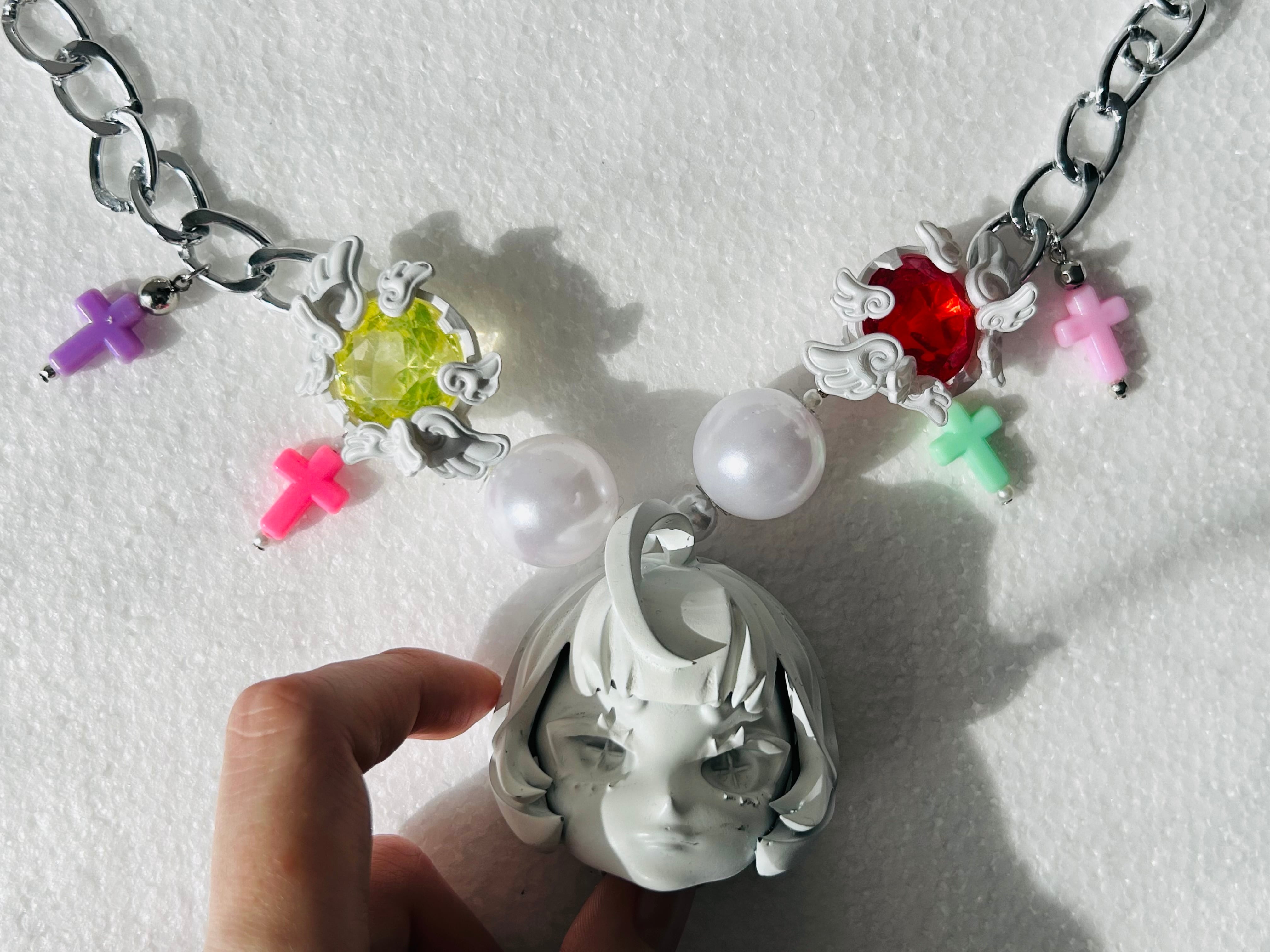 石膏像のような白と、カラフルなパーツの組み合わせ。天使なビジューパーツもあり豪華な仕立てです。
